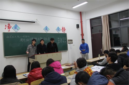 职业道德教育主题班会 2014年11月,建工系开展学习职业道德主题班会,通过学习社会主义核心价值观的主要内容:富强、民主、文明、和谐,自由、平等、公正、法治,爱国、敬业、诚信、友善。理解国家富强、民族振兴、人民幸福的中国梦的深刻内涵,通过学习理论知识、分组讨论、演讲等活动形式将职业道德融入到社会主义核心价值观学习的过程中。 班会上,班团干部认真组织,学生们积极发言、踊跃参与,集思广益学习社会主义核心价值观的相关知识,深刻意识到职业道德对于大学生成才的重要性,并表示要理论与实践相结合,争作具有高尚职业道德的现代公民。 撰稿:杨旭娇