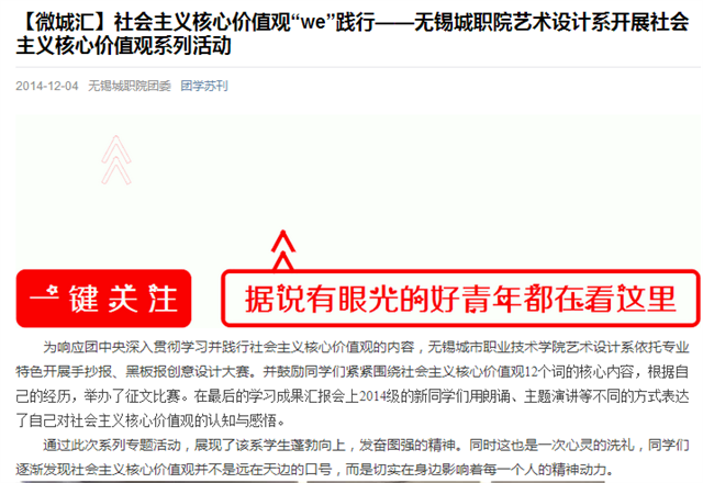——无锡城职院艺术设计系开展社会主义核心价值观系列活动 为响应团中央深入贯彻学习并践行社会主义核心价值观的内容,无锡城市职业技术学院艺术设计系依托专业特色开展手抄报、黑板报创意设计大赛。并鼓励同学们紧紧围绕社会主义核心价值观12个词的核心内容,根据自己的经历,举办了了征文比赛。在最后的学习成果汇报会上2014级的新同学们用朗诵、主题演讲等不同的方式,不同的情怀表达自己对社会主义核心价值观的认知与感悟。 通过此次系列专题活动,展现了该系学生蓬勃向上,发奋图强的精神。同时也是一次心灵的洗礼,同学们逐渐发现社会主义核心价值观并不是远在天边的口号,而是切实在身边影响着每一个人的精神动力。