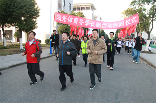 为全面贯彻落实《中共中央国务院关于加强青少年体育增强青少年体质的意见》(中发〔2007〕7号)、《中共江苏省江苏省人民政府关于切实加强青少年体育增强青少年体质的意见》(苏发〔2008〕3)号精神,营造阳光、团结、拼搏、向上的校园氛围,提高学生综合素质,丰富学生课余生活,根据《省教育厅办公室关于开展第八届江苏省千万学生阳光体育冬季长跑活动的通知》(苏教办体艺﹝2014﹞34号)要求,11月26日,我院在南北校区举行“阳光体育冬季长跑”起跑仪式。院党委书记高建宁、院长郁宝荣、副院长瞿立新、王远东出席仪式,院阳光体育运动领导小组成员、各系辅导员、部分班主任、全体学生参加。