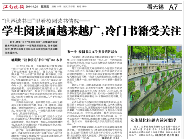《江南晚报》刊登的报道《无锡商报》刊登的报道教育电视台的报道4月23日,我院举行了第五届读书节开幕式,本次活动在学院和社会上引起了一定反响,锡城多家媒体予以关注报道。