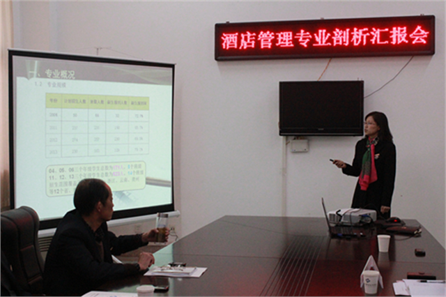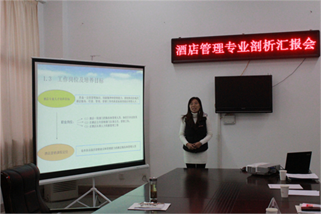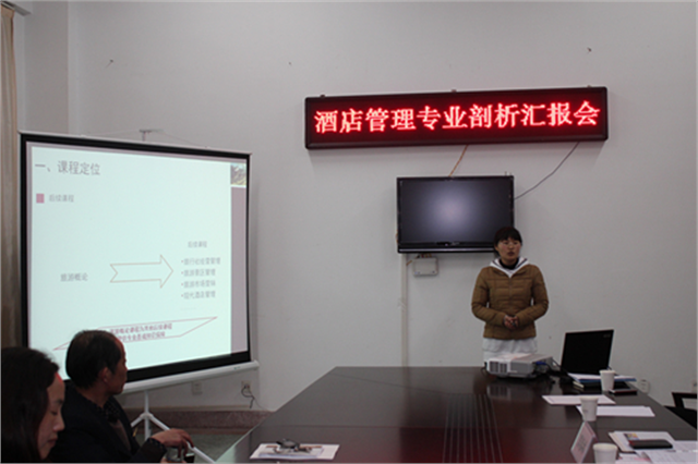 评估专家组专家听取旅游系专业剖析汇报及教师说课酒店管理专业教研室主任林武老师作专业剖析汇报黄克安院长认真听取专业剖析汇报周春林院长认真听取专业剖析汇报顾秀玲老师进行《酒店市场营销》课程的说课李丽梅老师进行《旅游概论》课程的说课11月25日下午,评估专家组专家黄克安、周春林在旅游系会议室分别听取了旅游系专业剖析汇报及两名教师说课。副院长瞿立新,校企合作单位无锡艾迪花园酒店总经理陈善军,评建办副主任、教务处处长王建以及旅游系相关专业教师参加了专业剖析及说课环节。