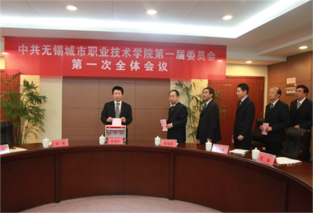 会议现场院党委书记高建宁同志主持会议并作重要讲话全体党委委员进行了投票选举新当选的全体党委委员合影留念11月3日下午,中共无锡城市职业技术学院第一届委员会举行第一次全体会议。新当选的党委委员高建宁、郁宝荣、刘彬、瞿立新、王远东、陈新参加会议。会议由高建宁同志主持。