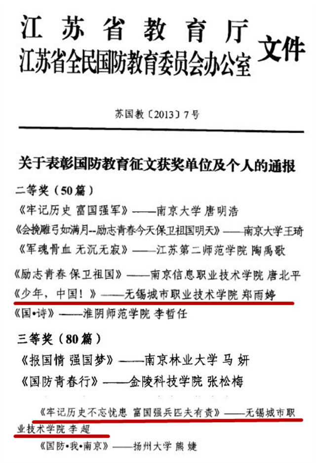 国防教育征文获奖喜报根据省全民国防教育委员会同省委组织部、省委宣传部、省教育厅、省民政厅、省妇联下发的《关于组织开展“我为国防作贡献”国防教育系列活动的通知》(苏国教办[2013]2号)和省教育厅下发的《关于举办国防教育征文活动的通知》(苏教办体艺[2013]8号)文件精神,近日,由我院人武部牵头,院团委、基础课部共同组织筹划,开展无锡城院国防教育征文比赛活动。