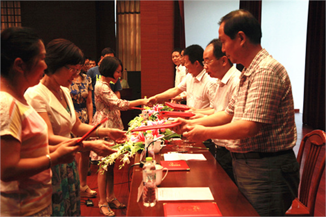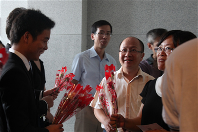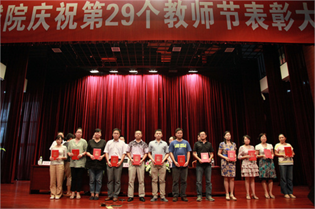 我院召开教师节表彰大会院党委书记高建宁发表讲话院长郁宝荣宣读表彰决定院领导为获奖者颁发荣誉证书获奖者合影留念教师代表发言院学生会向在场的教职工赠送鲜花9月10日下午,我院在报告厅召开大会,隆重庆祝第29个教师节,并对学院优秀教师、优秀教育工作者进行了表彰。院党政领导高建宁、郁宝荣、刘彬、邹亚平、瞿立新出席会议。全院教职工参加大会。会议由副院长瞿立新主持。