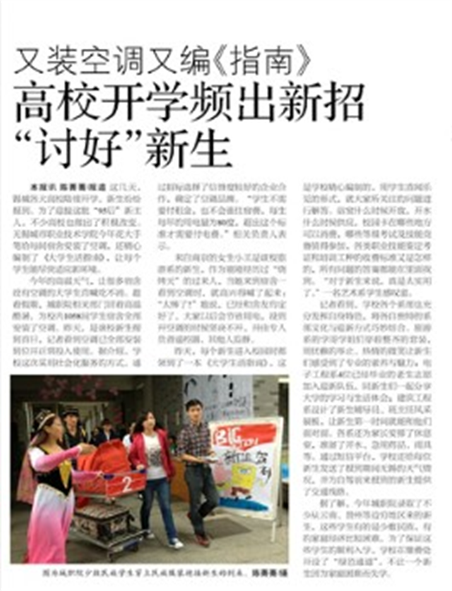 《无锡商报》A2版关于我院迎新的报道这几天,锡城各大高校陆续开学,新生纷纷报到。为了迎接这批“95后”新主人,不少高校也做出了积极改变。无锡城市职业技术学院今年花大手笔给每间宿舍安装了空调,还精心编制了《大学生活指南》,让每个学生能尽快适应新环境。