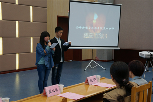 全体参会者为雅安地震遇难同胞默哀院团委书记夏心怡老师颁发红十字会员证5月8日,由我院红十字会主办的纪念“5·8”世界红十字日--“让爱接力,让梦飞翔”主题宣传活动在小报告厅举行。
