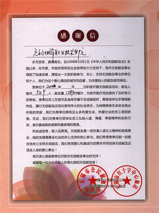 市红十字中心血站致信感谢我院“热血诚宝贵,救人品更高。无偿献血是一项充满人道主义精神的崇高事业,她的发展需要全社会的关心支持和热心参与……”3月11日,我院收到一封来自无锡市红十字中心血站的感谢信,对我院2012年为无锡市无偿献血事业的做出的贡献表示感谢。