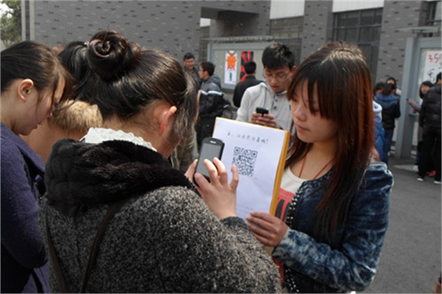 一女生拿出手机扫描团委微博二维码同学们积极参与微博话题讨论“我是‘光盘’一族我骄傲!”“节约文明从我做起!”伴随着学生们嘹亮的口号,3月5日中午, 我院“节约文明动起来”微博启动仪式在食堂门口举行。
