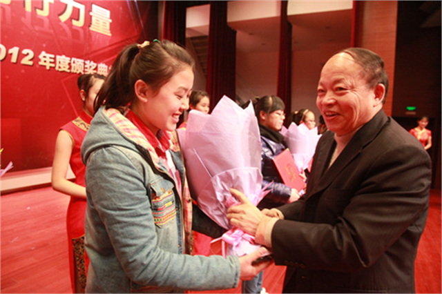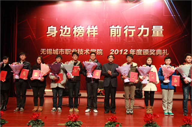 院党委书记高国强同志为获奖学生颁奖获奖学生代表上台领奖现场访谈华亮老师女生独唱《长大后,我就成了你》12月26日,“身边榜样、前行力量”——无锡城市职业技术学院2012年度颁奖典礼在图文报告厅举行。我院党政领导高国强、刘彬、邹亚平,市学校管理中心德育工作领导委员会全体成员及我院教师、学生代表共五百余人参加了颁奖典礼。