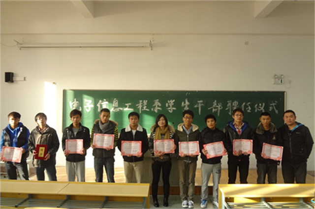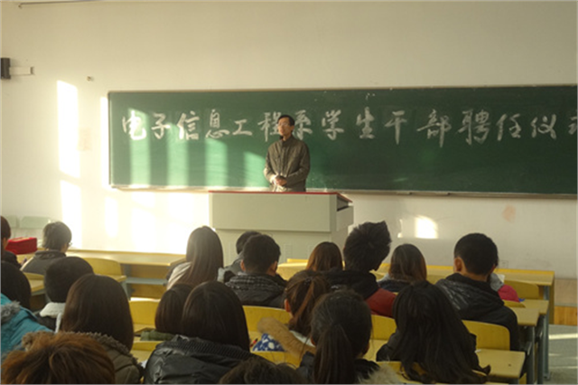 电信系党总支副书记贾迅在聘任仪式上讲话颁发聘书凝心聚力新征程,青春闪光十八大。近日,我院电子信息工程系在教学楼311室举行分团委学生会学生干部聘书颁发仪式,并召开学生干部素质培训讲座。院学工处副处长、系党总支副书记贾迅、系学生会分管教师、各班级主要学生干部和学生会全体成员参加了活动。