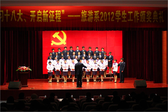 瞿立新副院长为学习十八大主题活动获奖学生颁奖2012年旅游系新发展党员在党旗下宣誓学生合唱《国家》“回望过去,我们辉煌无限;把握现在,我们努力奋进;着眼未来,我们前程似锦”。近日,旅游系在图文信息中心大报告厅举行了2012年颁奖典礼,集中表彰在院系各项活动中涌现出来的先进集体和个人。副院长瞿立新,旅游系主任、党总支书记周建出席颁奖典礼,旅游系教师及2012级400余名师生参加了典礼。