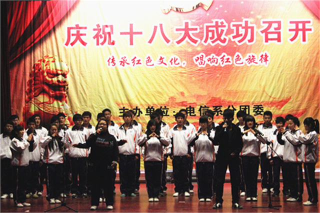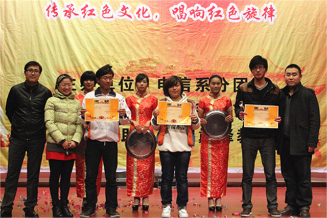 合唱比赛现场电信系教师与获奖班级代表合影为庆祝党的十八大顺利闭幕,丰富学生的课余文化生活,增强班级凝聚力,弘扬爱国热情, 11月28日晚,我院电子信息工程系在图文信息中心大报告厅成功举办合唱比赛。
