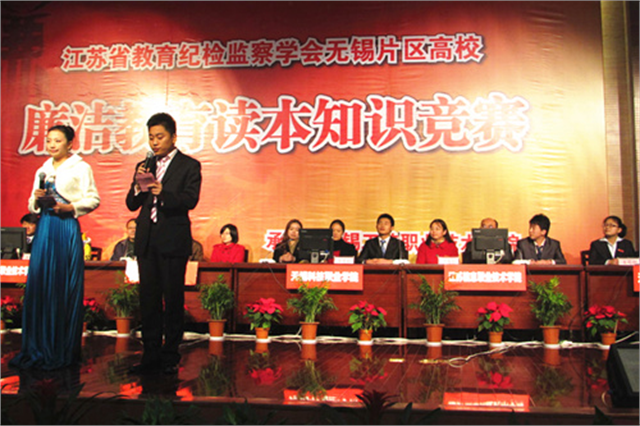 知识竞赛现场我院荣获三等奖11月23日下午,江苏省教育纪检监察学会无锡片区高校廉洁教育读本知识竞赛在无锡工艺职业技术学院举行。江苏省教育纪工委副书记荆和平莅临指导,在锡高校纪委书记、纪检监察部门负责人在现场观看了比赛。