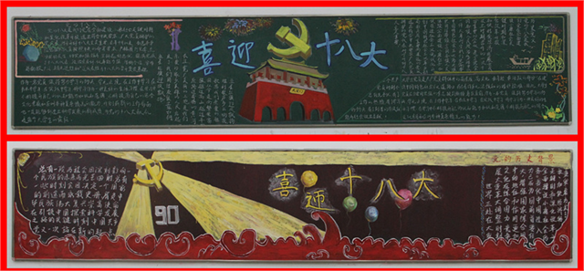 “喜迎十八大”主题黑板报(一)“喜迎十八大”主题黑板报(二)为迎接党的十八大召开,营造学院积极向上的文化氛围,点燃城院学子爱国、爱党热情,近日,我院建筑工程系以班为单位开展了“喜迎十八大”主题黑板报活动。