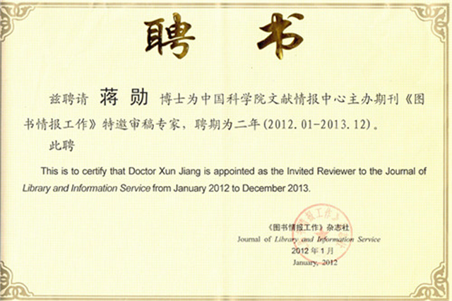 蒋勋博士受聘证书近日,我院电信系蒋勋博士被中科院文献情报中心聘为《图书情报工作》期刊的特邀审稿专家。该期刊为国内核心刊物,且为CSSCI来源期刊,是国内情报学领域具有权威性与指导性的刊物,复合影响因子1.103,位居本学科第4名。