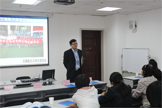 电信系12级新生到无锡航天信息有限公司参观学习公司领导为同学们介绍行业发展情况10月18日下午,我院电信系组织12级计算机应用(财务软件)班学生到校企合作单位——无锡航天信息有限公司参观学习。电信系计算机教研室教师丁一博士带队参加了交流活动。