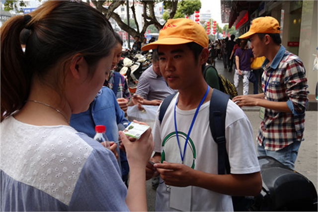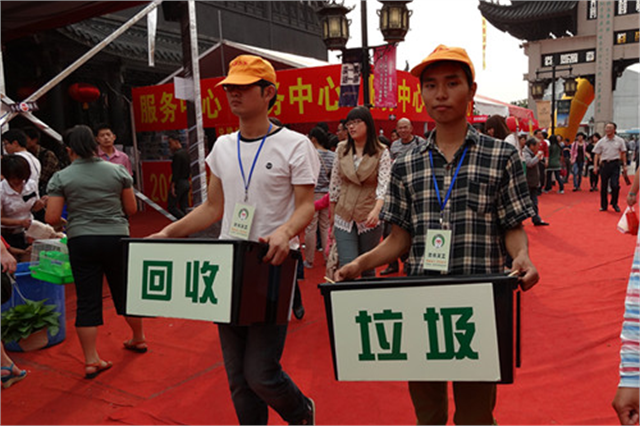 志愿者手持“垃圾”和“分类”字样的回收箱志愿者向游客宣传环保活动为弘扬“奉献,友爱,互助,进步”的志愿服务精神,引导更多的人关注并参与志愿服务,10月4日至6日国庆长假期间,我院建筑工程系15名志愿者来到南禅寺引导市民将随身垃圾合理扔放。