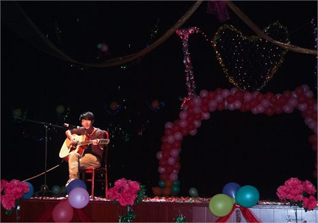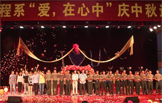 大一新生吉他独唱师生观看晚会特别视频晚会在热烈的气氛中圆满结束适逢双节将至,9月26日晚,电信系 “爱,在心中”——迎中秋,庆国庆暨2012级迎新晚会在体育馆二楼拉开帷幕。电信系主任杨晓健、党总支副书记贾迅及全体辅导员、2012级班主任出席晚会,同时,军训教官作为特邀嘉宾被邀请至现场与全体电信系新生欢聚一堂。