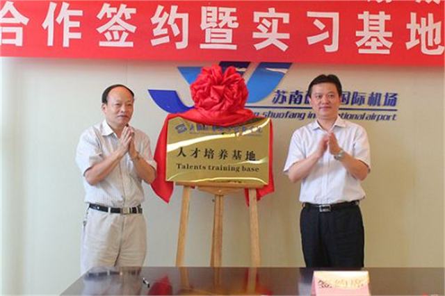 挂牌仪式现场双方签署产学研协议双方为基地揭牌院领导参观机场航站楼为适应省、市民航业和交通产业“十二五”战略规划要求,进一步提升学院服务地方经济社会发展的能力和水平,2010年,我院旅游系首次招收旅游管理(民航服务与高铁乘务)专业学生。当前,学生即将进入顶岗实习阶段,为使学生能熟练掌握航空服务技能,更好地适应航空企业发展需求,学院未雨绸缪,经过近半年的洽商,近日与苏南国际机场集团达成共建人才培养基地协议,共同培养民航业亟需的高技能服务型人才。