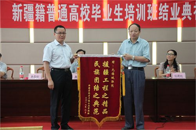 |  | | 新疆班领队唐昌松向我院党委书记高国强赠送锦旗 |