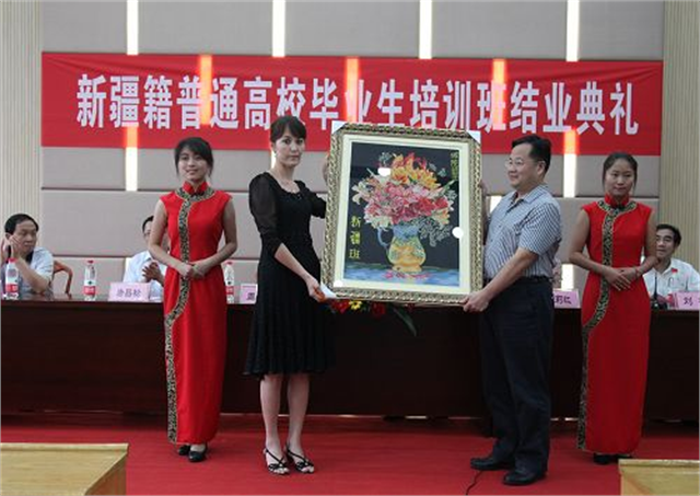 |  | | 学员买尔哈巴·艾拜向学院赠送亲手制作的十字绣 |
