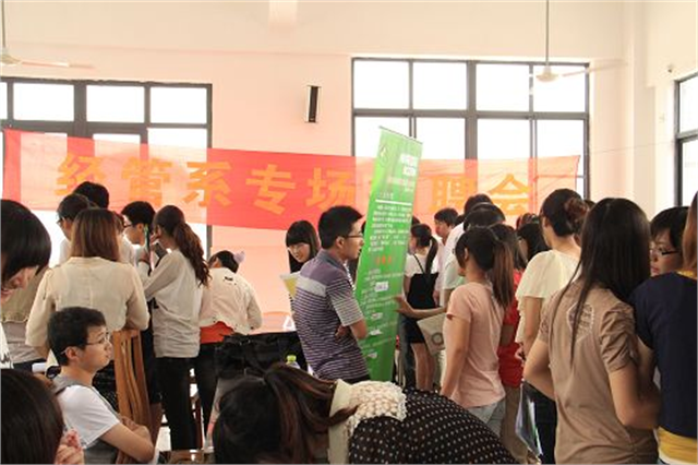招聘会现场6月6日,我院经济贸易管理系在学院餐厅三楼成功举办“经管系2012年夏季招聘会”,这是经管系进入新校区以来组织的第二次大型专场实习招聘会。经过前期的紧密联系和充分准备,来自北京、上海、南京、苏州、无锡等地50多家省内外企业来院招聘,提供就业岗位近800个。我院党委副书记刘彬、经管系党政负责人鲁继业、赵宏宾亲临招聘会现场指导工作。共有400多位同学参与此次招聘,有200多名学生已与用人单位初步达成了实习就业意向。