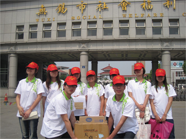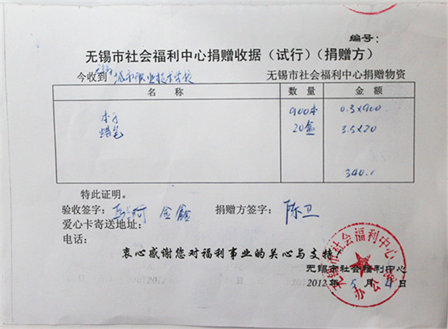旅游系志愿者为福利院小朋友送去学习用品福利院出具捐赠证书为深入践行胡锦涛总书记在纪念建团90周年大会上的重要讲话精神,用实际行动展示当代青年学子的青春风采,6.1前夕,我院旅游系志愿者带着爱心来到无锡市社会福利院,为福利院小朋友送去价值近400元的本子、蜡笔等学习用品,福利院院长热情地接待了志愿者一行,向大家介绍了市社会福利院的基本情况,并代表孩子们对志愿者们表示感谢,同时为大家颁发了捐赠证书。