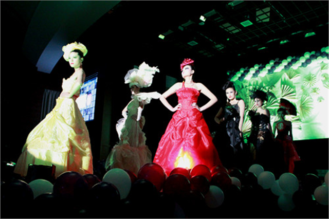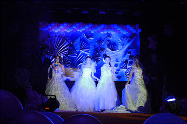 “春霓夏裳”时装晚会现场婚纱秀《梦中婚礼》绚丽的色彩,精巧的手工,热情的音乐。5月17日晚,我院艺术设计系第二届“春霓夏裳”时装走秀晚会在报告厅拉开帷幕。此次晚会是我院校园文化艺术节中的一场重头戏,由形象设计专业Fashion Style社团承办。艺术设计系主任江文、党总支副书记陈霞及无锡金大国际美容美发化妆学校校长出席晚会现场。