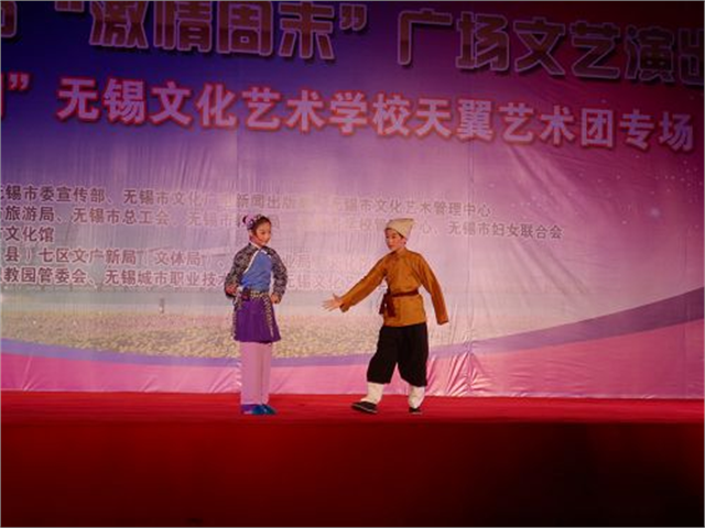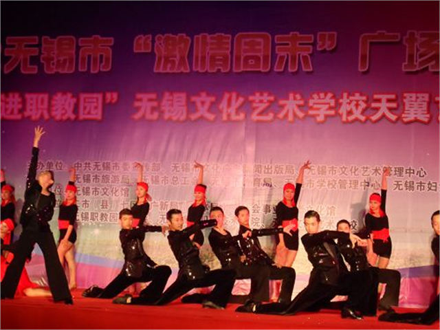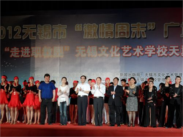 舞蹈表演锡剧《小夫妻相会》出席领导与演出人员亲切合影5月10日,我院篮球场星空浩瀚,灯火辉煌。2012无锡市激情周末文艺广场演出“走进无锡职教园”无锡文化艺术学校天翼艺术专场在此隆重举行。4000多名职教园高职院校的师生手持荧光棒汇聚成欢乐地海洋。无锡市文化馆的领导,无锡职教园职教校区公共服务管理中心主任邵小明,我院党政领导高国强、周伟灿、刘彬和部分职教园入驻院校领导与师生们一起兴致勃勃地观赏了一台精彩纷呈的文艺节目。