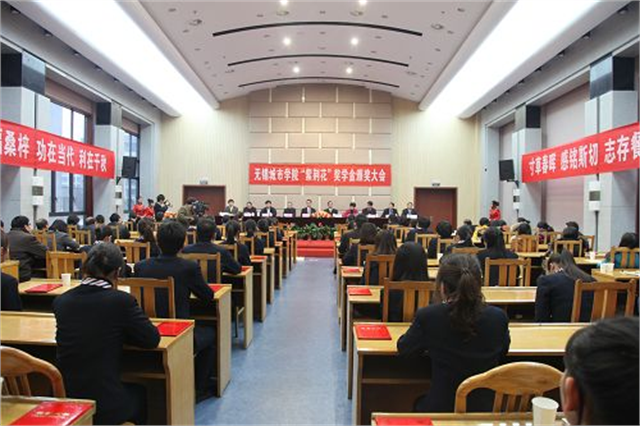 1月8日,由无锡市政协港澳委员捐资设立的“紫荆花”奖学金正式落户我院,并在我院图文信息中心报告厅举行了首届颁奖仪式。市政协副主席蔡捷敏、市委统战部副部长孙振兴、市政协港澳台侨外事民宗委主任吴春芬,市政协港澳委员唐庆年、丁天立、荣文瀚、邹伟文、黎名驹,我院党委书记高国强、院长周伟灿等领导及嘉宾出席仪式。市政协、市委统战部、我院相关职能部门、各系部负责同志以及教师代表、获奖学生近百人参加了仪式。仪式由副院长瞿立新主持。 |