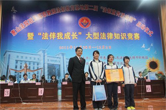 我院学生荣获无锡职教园法律知识竞赛竞赛第二名的好成绩11月28日下午,我院经济贸易管理系100名学生在院党委副书记刘彬同志的带领下,参加了在惠山中等专业学校报告厅举行的惠山法院驻无锡职教园法制教育基地第二届“法制宣传活动周”启动仪式。启动仪式结束后,我院李灿灿、刘敏明、王玺惠三名同学代表学校参加了“法伴我成长”法律知识竞赛,与到场的其他七所院校的参赛队员展开激烈的角逐。经过一个多小时的PK及紧张的加时赛,最终,我院学生赢得了竞赛第二名的好成绩。