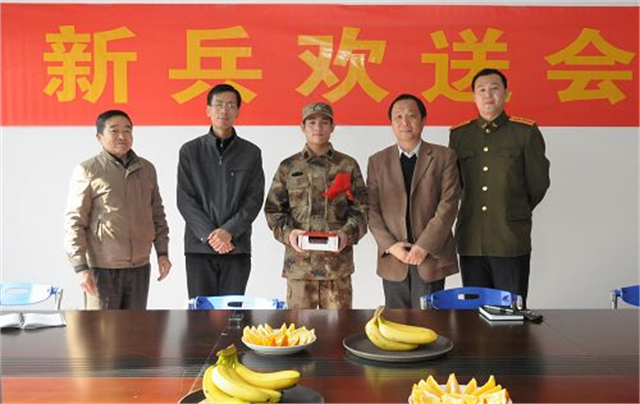 院领导与吴鹏同学合影留念简朴而热烈,隆重又亲切。11月22日,我院在办公楼109会议室举行入藏新兵入伍欢送会,为即将入藏的我院电子信息工程系吴鹏同学送行。副院长邹亚平同志出席会议并讲话,院武装部副部长宋建良、电子信息工程系党政负责人杨晓健、贾迅等同志参加了欢送会。