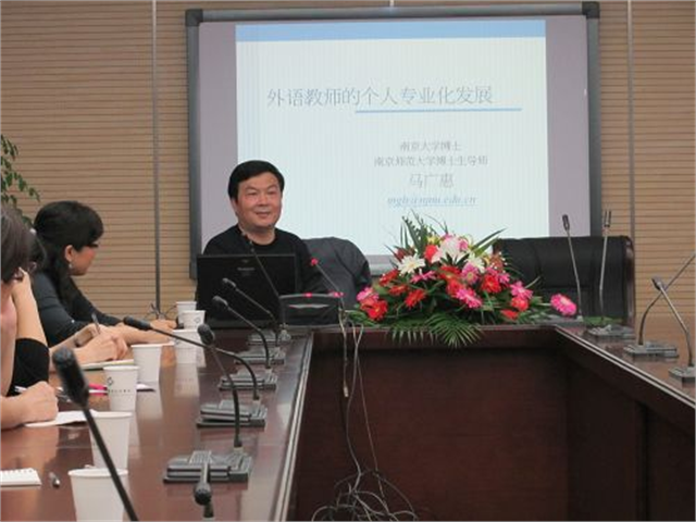 南京师范大学博士生导师马广惠教授来我院作学术讲座马广惠教授就“外语教师的个人专业化发展”与我院教师进行了交流与讨论11月18日下午,南京师范大学外国语学院教授、博士生导师马广惠教授应邀来我院作题为“外语教师的个人专业化发展”的学术讲座。讲座由基础课部主任赵芝英主持,我院全体外语教师和兄弟院校外语教师代表聆听了本次讲座。讲座开始前,我院院长周伟灿教授热情会见了马教授。