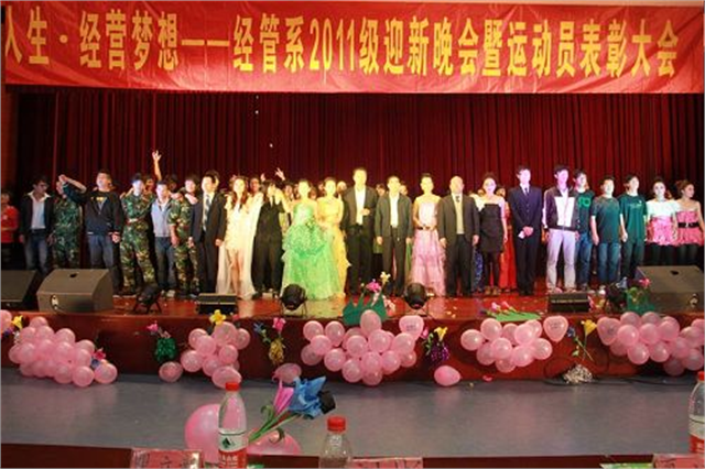 经管系举办“管理人生经营梦想——2011级迎新晚会暨运动员表彰大会”经济贸易管理系鲁继业主任致辞院党委副书记刘彬同志为经管系中澳合作班李森等三位同学颁发澳大利亚博士山学院的BHI奖学金11月9日,我院经管系“管理人生 经营梦想——2011级迎新晚会暨运动员表彰大会”在图书馆报告厅隆重举行。院党委副书记刘彬、团委书记夏心怡、百脑汇无锡电子技术开发有限公司销售部经理蒯豪以及经管系党政领导、教师代表和2011级全体新生参加了晚会。