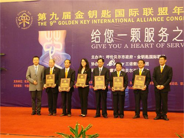 会议现场我院旅游系周建主任(左三)上台领奖7月5日至9日,第九届金钥匙国际联盟年会在内蒙古呼伦贝尔市隆重举行。国际金钥匙组织中国区主席孙东、呼伦贝尔市副市长王宝成、金钥匙国际联盟欧洲区总裁Aldo Giacomello、加拿大尼亚加拉大学校长Dan patterson、欧洲酒店总经理协会(EHMA)第一副总裁Michel Fernet出席本届年会并致辞。