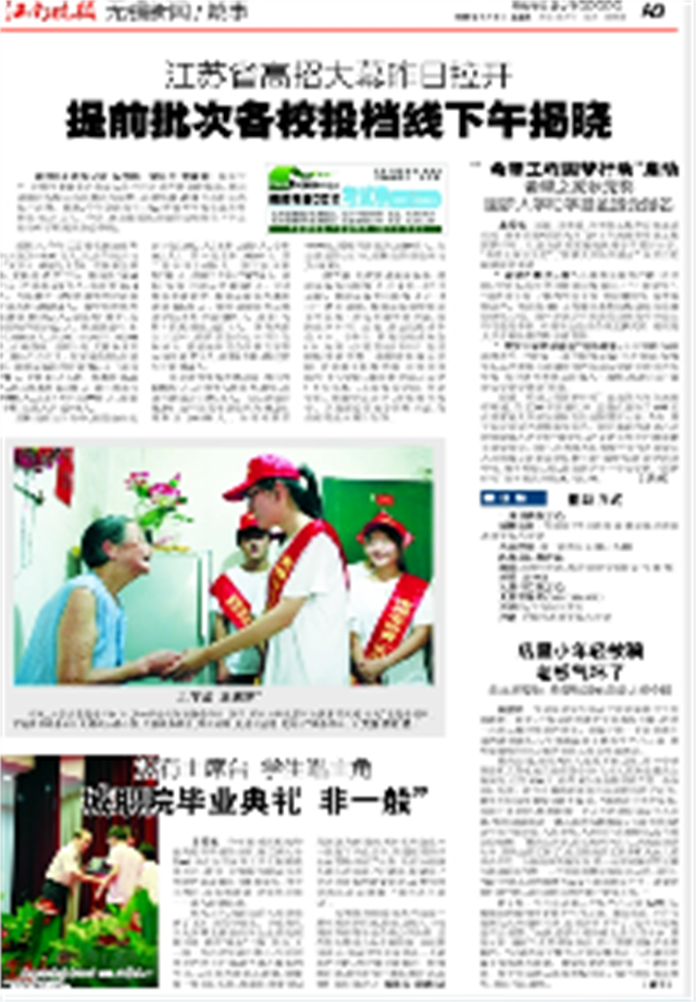 江南晚报7月8日A9版上关于我院2011届学生毕业典礼的报道今年锡城高校的毕业典礼似乎格外热闹。继江南大学5000毕业生首次穿上学士服隆重毕业后,昨日,无锡城市职业技术学院的毕业典礼也隆重举行。没有主席台、家长做演讲、学生唱主角……让人印象深刻。