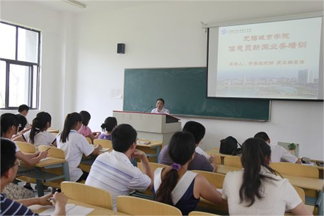 无锡市委组织部电教中心吴立群主任为院内信息员讲授新闻业务的相关知识为加强我院信息员队伍建设,全面提升信息员的理论素质和业务水平,更好地宣传报道学院在教学、科研、管理工作中所取得的新成绩和新进展,6月23日下午,我院召开院内信息员业务培训会议。无锡市委组织部电教中心主任、原《无锡日报》主任记者吴立群同志应邀为与会者讲授新闻业务的相关知识。各系、各部门信息员,校学生会记者、学生社团——记者协会的成员共50余人参加了培训。会议由党政办副主任杨旸同志主持。