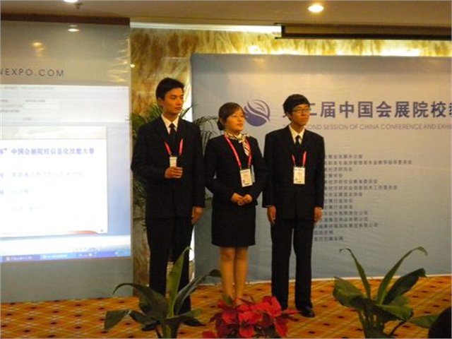 旅游系三名学生参加比赛获奖学生与指导教师合影6月3日至5日,第二届中国会展院校教学信息化交流会在西安市召开。此次会议由教育部高职高专旅游管理类专业教学指导委员会和中国会展经济研究会联合主办。52所本、专科院校的领导、教师及北京、上海、深圳等地会展行业协会的领导共200多人与会。我院旅游系周建主任、张岩岩和丛哲老师参加了交流会。