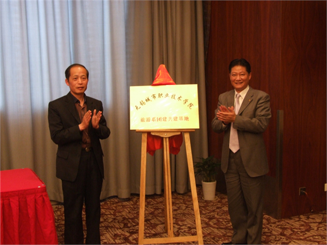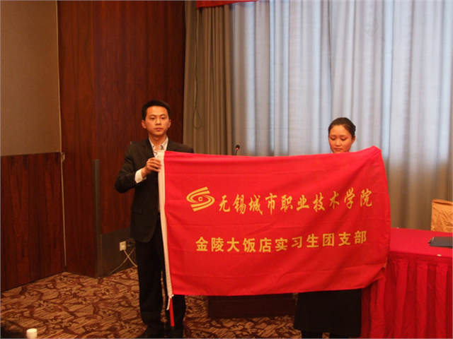 共建基地揭牌旅游系分团委向实习生团支部授旗4月29日,我院首个校企共建实习生团支部——无锡城市职业技术学院金陵大饭店实习生团支部在无锡金陵大饭店成立,同时举行了无锡城市职业技术学院旅游系、无锡金陵大饭店团建共建基地签约揭牌仪式。无锡金陵大饭店总经理黄浩俊、副总经理吕菁英、党支部书记顾峰,我院旅游系党总支书记于丽华、主任周建、院团委书记夏心怡等领导出席了签约仪式,旅游系驻酒店全体团员实习生以及酒店青年职工代表百余人参加了此次活动。仪式由旅游系分团委书记宋祖楼主持。
