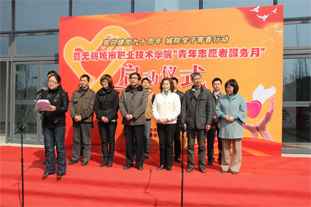 我院青年志愿者服务月启动3月10日下午, “喜迎建党九十周年,城院学子青春行动”暨无锡城市职业技术学院青年志愿者服务月启动仪式在体育馆前隆重举行。院党委副书记刘彬同志、学工处处长苏兴华同志、院团委书记夏心怡同志及各系党总支副书记和分团委书记出席了启动仪式,全院青年学生志愿者参加了此次活动。启动仪式由夏心怡同志主持。