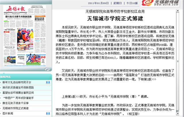 《无锡日报》关于新校区落成启动典礼的报道1月8日,无锡城市职业技术学院、无锡高等师范学校新校区落成启用典礼在无锡城职院隆重举行。市长毛小平、市人大常委会副主任王金大、副市长华博雅、市政协副主席张士怀出席典礼和相关学术论坛。据了解,两所学校新校区的落成启用,将使进驻无锡(藕塘)职教园的学校增加至8所,师生规模达8万余人。