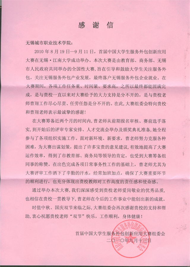 感谢信全文2010年8月19日-9月11日,首届中国大学生服务外包创新应用大赛在江南大学成功举办。我院委派经济贸易管理系曹翔老师全程参与大会组织与服务工作。近日,大赛组委会给我院发来感谢信,感谢我院对大赛给予的大力支持,特别感谢曹翔老师尽心尽责的工作态度和无私奉献的工作精神。