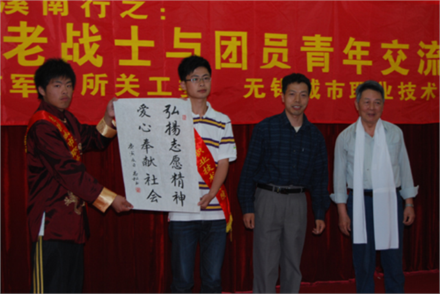 |  | | 蒋志松老前辈给学生们挥墨题词:“弘扬志愿精神,爱心奉献社会” |