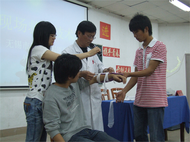 六院医生现场为同学们演示急救的措施在全国第二个防灾减灾日来临之际,院团委、红十字会、学生会在马山校区举行了全国防灾减灾日急救演示、演练活动。