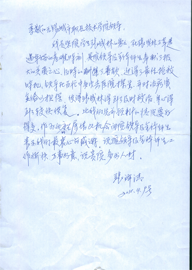 张成林舅舅写给学校的感谢信.jpg我院校园网于2010年3月9日报道了07级建筑工程技术2班张成林同学不幸遭遇车祸,广大师生慷慨解囊献爱心的新闻。新闻刊登后,引起了全院师生的广泛关注,全院掀起了一股伸出援手,奉献爱心的热潮,目前已募集捐款3万余元。