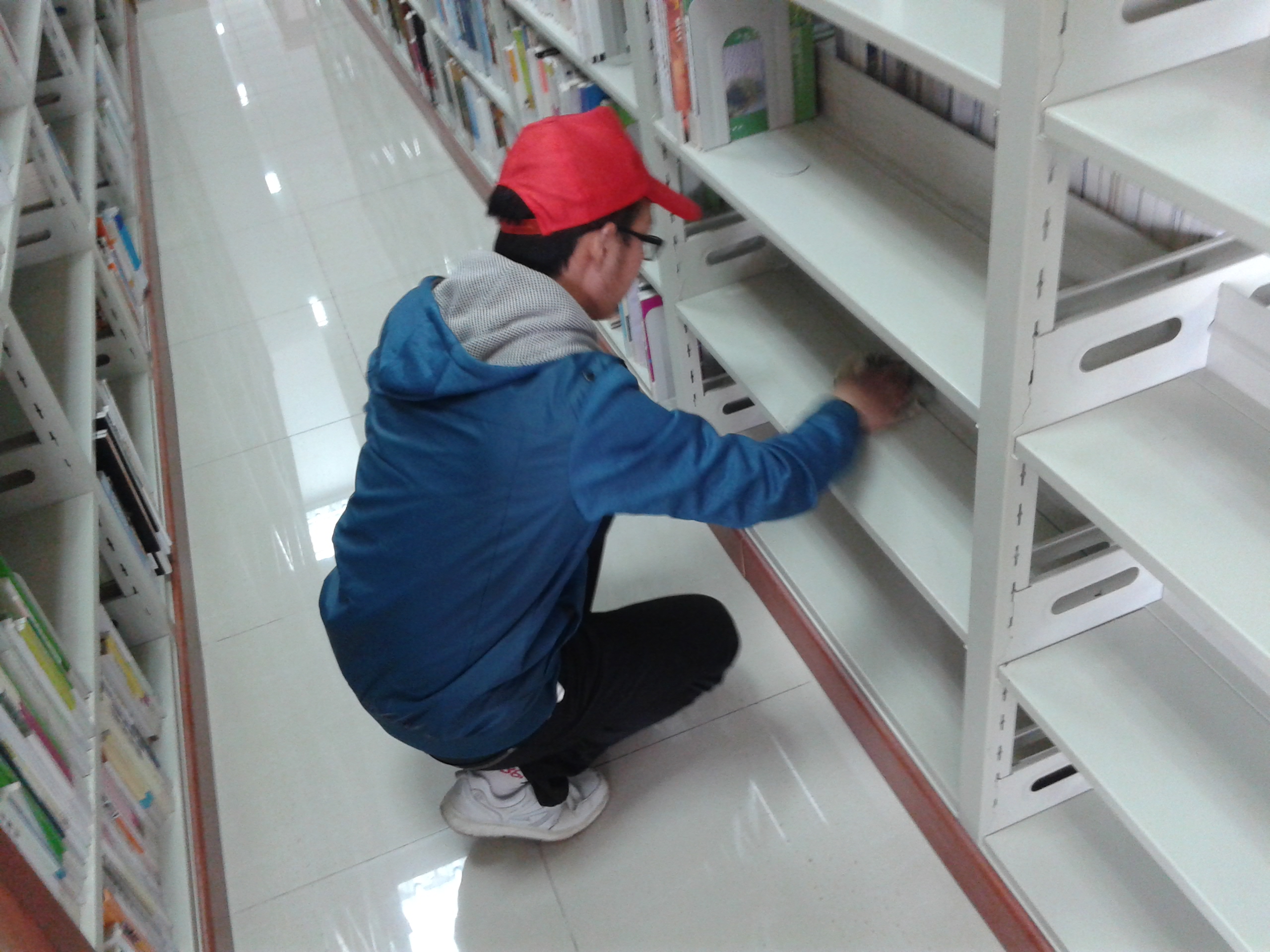 志愿者们在院图书馆擦拭图书架