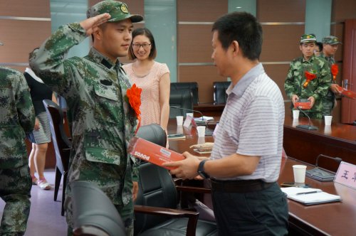今年我院大学生夏季征兵校内报名并送检25名男生,经过体检、政治考核等环节,最终有刘旭壮等10名同学批准光荣入伍。9月8日下午,我院召开2015年新兵入伍欢送会。院党委书记高建宁、副院长陈新、学院人武部同志、各二级学院书记、入伍新兵和他们的辅导员、班主任等参加了欢送会。副院长陈新主持会议。 带着家人的嘱托,学院的期望,肩负着保家卫国的重任,即将走入军营的10名新兵同志,高举右拳,庄严宣誓:决心严格遵守部队纪律,认真学习,刻苦训练,不辜负党和人民的重托,用实际行动为国效力。 院党委书记高建宁并作重要讲话。高建宁书记在讲话中首先对同学们积极投身国防事业的行动给予了充分肯定,对各二级学院的认真推荐和人武部的辛勤工作表示了衷心感谢。他希望同学们能胸怀大志,到部队后要刻苦训练、服从命令、顽强拼搏、不断进取,在部队这个“大学校”、“大熔炉”里好好锤炼,并对10名新兵同志提出“政治合格、军事过硬、作风优良、纪律严明”的十六字要求,并且希望新兵们谦虚谨慎、努力学习,全面掌握政治、军事、科技、文化知识,不断提高综合素质和能力;要时刻牢记自己是来自无锡城院的优秀大学生,勇敢地经受各种考验,尽快完成由一名地方大学生到一名合格军人的转变。 最后,陈新副院长希望同学们经常与家长和学院老师保持联系,学院将始终关注着同学们的进步并期待着立功受奖的喜讯。把自己锤炼成为一名钢铁般的战士和祖国建设有用之才,为学院争光。 院党委书记高建宁与入伍新兵亲切交谈并发放纪念品 入伍新兵与学院领导老师合影留念 撰稿:于晓东 |