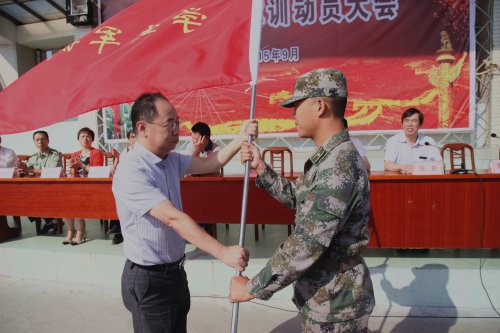 雄壮的国歌声后,院党委书记高建宁作重要讲话。他首先对2015级新生表示了热烈欢迎,对中国人民解放军部队官兵致以衷心的感谢。随后,高书记以详实的数据就我院学科建设、师资队伍、参军入伍、报考军校等方面作了具体介绍。院长郁宝荣同志将2015级军训团团旗授予此次军训团团长。