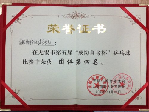 11月21日,无锡市第五届“成协自考杯”乒乓球比赛在江阴职业技术学院举行。本次比赛由无锡市教育考试院、无锡市成人教育协会主办,江阴职业技术学院承办,举办高等教育自学考试“专接本”工作的中、高等职业院校和市(县、区)招考办,省教育考试院共18支队伍参赛。 我院高度重视、积极参与,派出了由王远东副院长为领队,王飞老师、张月琴老师和两名学生运动员等成员组成的代表队。本次比赛为团体赛,每场比赛包括五个项目,即男子第一单打、女子第一单打、男女混合双打、男子第二单打、女子第二单打。比赛分为两个阶段,第一阶段采用分组单循环赛制,第二阶段采用淘汰赛及附加赛制。我院代表队沉着应战、稳扎稳打,经过2场循环赛和3场淘汰赛的激烈角逐,获得了第四名的好成绩,王飞老师因参加第一、第二阶段全部比赛并全胜获优秀运动员奖。 此次乒乓球比赛不仅充分展现了我院团结协作、奋力拼搏的体育风采,也加强了与兄弟中高等职业院校和市(县、区)招考办间的交流,为全面推进我市高等教育自学考试贡献了力量。 获奖老师学生合影 荣誉证书 荣誉证书 |
