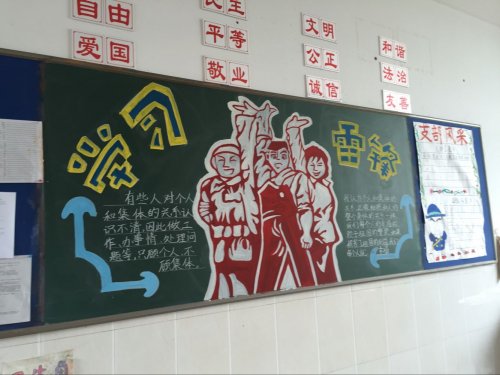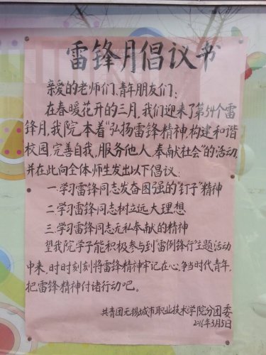 当院外奏起爱的歌曲时,院内也正刮起一阵雷锋新风。院分团委发起了雷锋月倡议书,各系各支部也围绕“雷锋精神”运用手中的画笔描绘了一幅幅的主题黑板报、宣传画,传递着心中对雷锋的崇敬之情,同时也将雷锋意志宣传于学院的每个角落。虽然人已去,但精神永驻。
